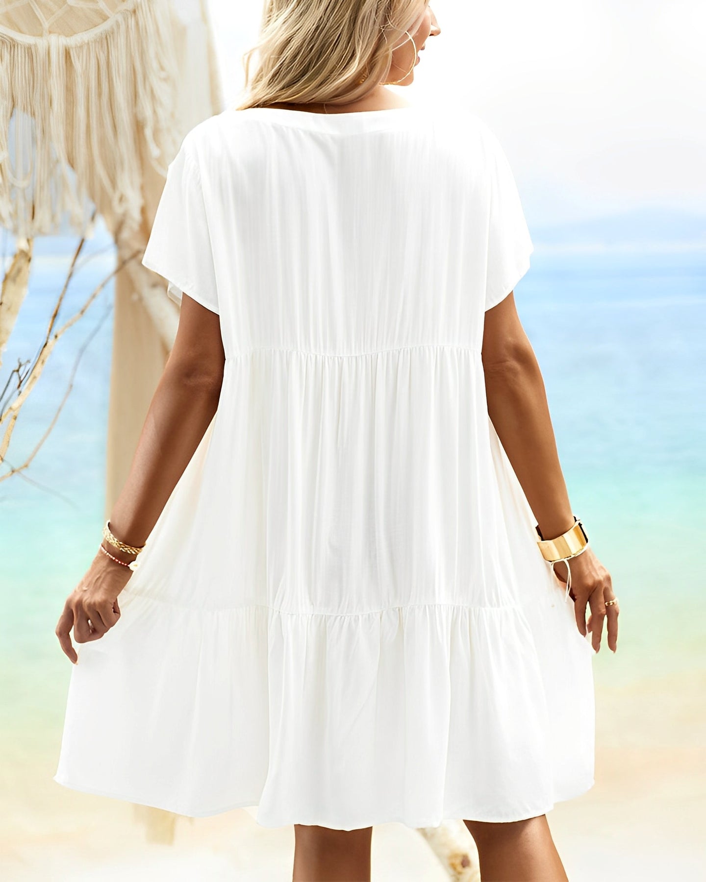 Featuring a flattering V-neckline and soft short sleeves, this relaxed-fit dress drapes gently over the body for an airy, feminine silhouette. The gathered waist detail adds subtle shape while maintaining a loose, comfortable feel.
